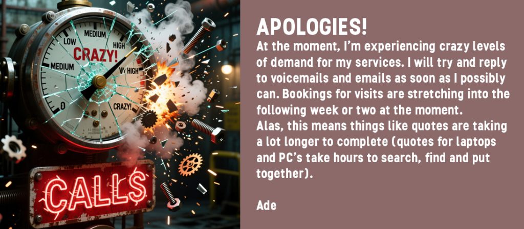 4 Nov 25: Work is still very busy (thanks to all who call/email) - I'm trying my best to keep on top of it all!! Prices for ram, solid state drives and in particular, optical drives (DVD-RW) have gone up drastically over the past month or two, so I've had to tweak the price and upgrades of my popular Matrexx PC build. Prebuilt items such as PC's and Laptop have also moved up in price due to the component increases.As usual, I will be taking quite a bit of time off over December (definitely earnt it this year!!), as I don't tend to take time off during the rest of the year. If you're looking for new tech to replace your aging tech, please bare this in mind and get in touch sooner rather than later. Ade -
